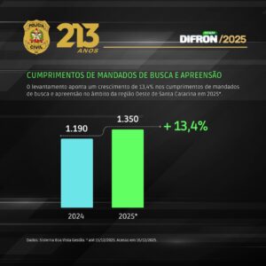 A Polícia Civil de Santa Catarina, na região Oeste, deu cumprimento a 1350 ordens judiciais de busca e apreensão em 2025. Um crescimento de 13,4% comparado ao mesmo período de 2024.