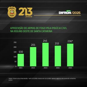 A apreensão de armamento na região da DIFRON também foi expressiva em 2025, sendo que esse ano a Polícia Civil já apreendeu 236 armas de fogo, um aumento de mais de 9 % em relação ao ano anterior.
