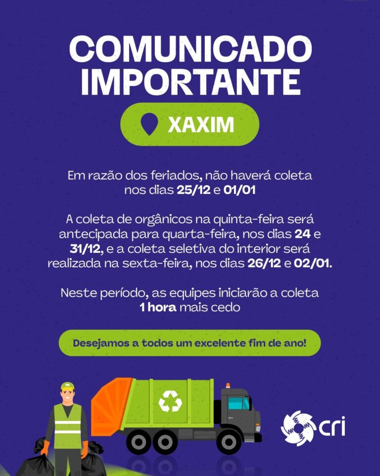 🔄 O que muda: • A coleta de resíduos orgânicos será antecipada, passando de quinta para quarta-feira. • Nos dias 24/12 e 01/01, a