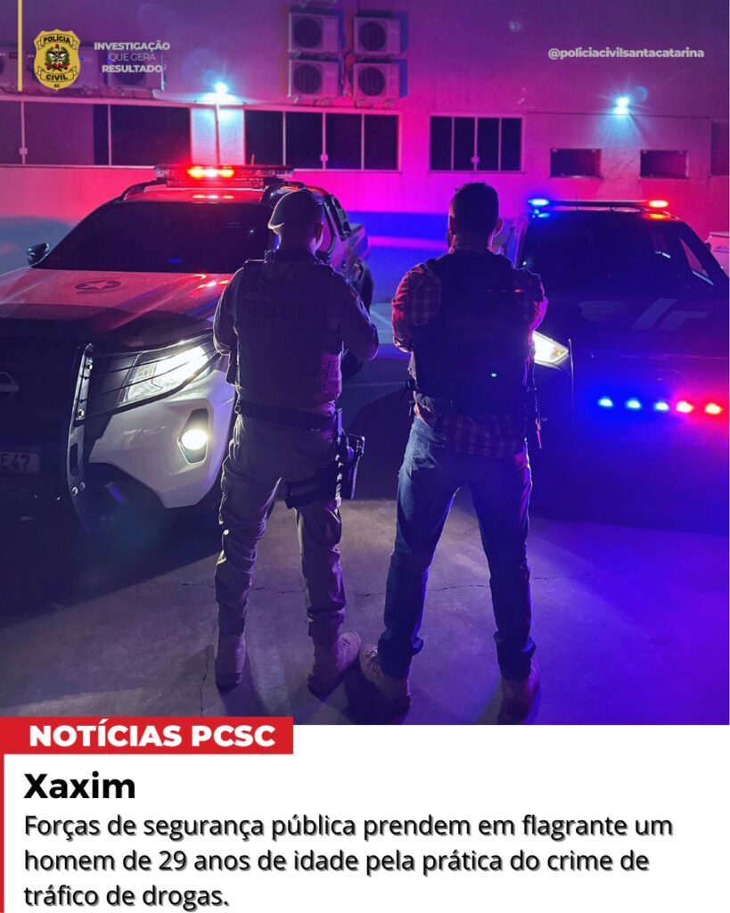 A Polícia Civil do Estado de Santa Catarina, por meio da Delegacia de Polícia da Comarca de Xaxim e da Delegacia de Polícia do Município de Marema, em ação integrada com a Polícia Militar do Estado de Santa Catarina, por intermédio da 2ª Companhia de Xaxim, efetuou, na tarde de sexta-feira (03/10/2025), por volta das 16h00min, a prisão em flagrante de um homem de 29 anos de idade pela prática do crime de tráfico de drogas, no Bairro Ari Lunardi, nesta Cidade de Xaxim, Estado de Santa Catarina.