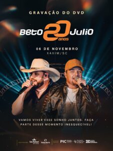 É em Xaxim, cidade natal que os viu nascer e crescer como artistas, que a dupla Beto & Julio escreverá um dos capítulos mais importantes de sua carreira: a gravação do DVD “20 Anos”. Um show que promete ser um divisor de águas, carregado de emoção, energia e da autenticidade que sempre marcaram esses dois irmãos apaixonados pela música sertaneja.