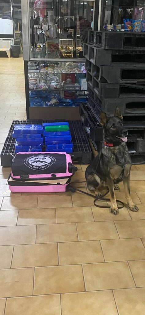 Por volta das 4h10, a cadela K9 Aruana indicou interesse em uma mala de cor rosa que estava no compartimento de bagagens de um ônibus da empresa Unesul, que fazia o trajeto de Campo Grande (MS) a Florianópolis (SC). Após a sinalização do animal, os policiais realizaram a vistoria e localizaram 24 tabletes de substância semelhante à maconha no interior da bagagem.