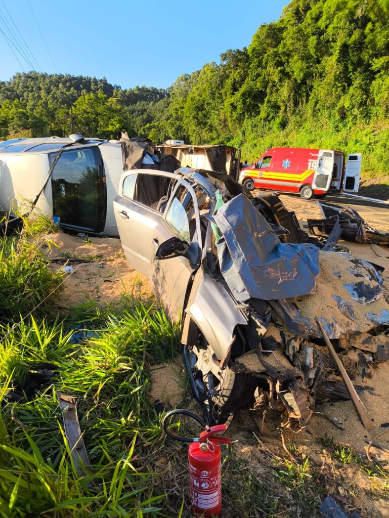 O acidente foi as 18h00 próxima a área industrial quando um bitrem carregado de farelo de soja que trafegava sentido Xaxim/Cordilheira tombou sobre veículos que vinha no sentido oposto ao entrar em uma curva da rodovia.