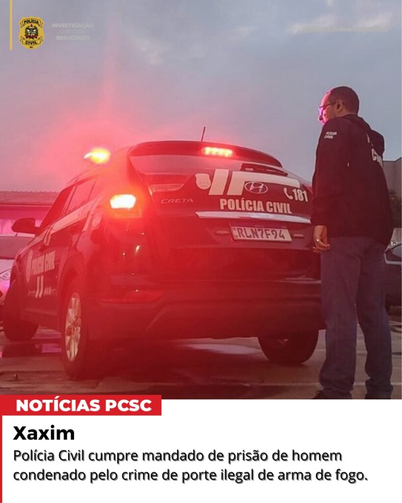 A Polícia Civil de Santa Catarina, por meio da Delegacia de Polícia da Comarca de Xaxim, com o apoio das unidades policiais dos municípios de Marema e Lajeado Grande, deu cumprimento, na tarde desta segunda-feira, a mandado de prisão expedido em desfavor de um homem de 45 anos.