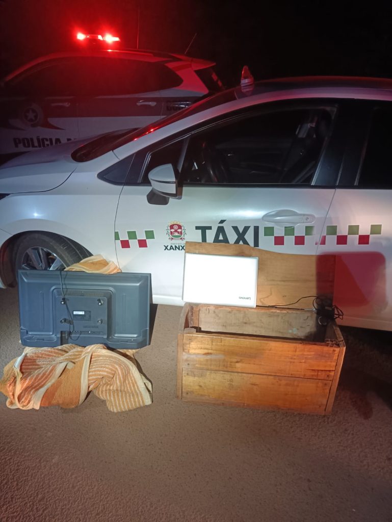 A situação atípica gerou suspeita da polícia, porque já havia registrado furto na cidade momentos antes. Em barreira policial e com as informações do veículo envolvido, a guarnição montou uma barreira e abordou o táxi Nissan, ocupado por duas pessoas. O taxista, de 59 anos, relatou ter sido contratado para fazer o frete em Ouro Verde, onde o passageiro que ele transportava alegou buscar os objetos de negócio desfeito.